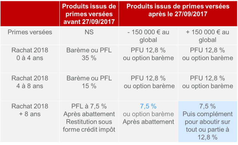 Le Prélèvement Forfaitaire Unique à 12,8 % + prélèvements sociaux de 17,2% s’appliquent aux rachats à compter du 1er janvier 2018 concernant les produits des contrats de capitalisation et d’assurance vie issus de versements à compter du 27 septembre 2017, SAUF : Les produits afférents à des primes versées à compter du 27 septembre 2017 lorsque le montant des primes nettes (des quotes parts de capital rachetées) versées au 31 décembre de l’année précédant le rachat sur l’ensemble des contrats (de capitalisation et d’assurance vie, avant et après le 27 septembre 2017) n’excède pas 150 000 € par bénéficiaire du rachat de contrat dont il est titulaire. Dans les autres cas, c’est le prélèvement forfaitaire non libératoire qui s’applique par défaut, sur la quote-part des produits attachés aux primes versées à compter du 27 septembre 2017, au taux de :- 12,8 % si le contrat a moins de 8 ans