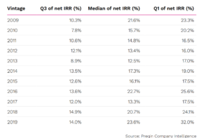Evolution des taux de rendement interne nets (IRR) pour les fonds de Private Equity français, segmentés par quartile et par année de création (vintage).